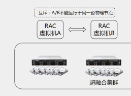·超融合平台创建2台KVM虚拟机部署Oracle服务并分配在不同物理服务器(为方便起见,1号服务器 跑RAC1 KVM虚拟机 ,2号服务器跑RAC2 KVM虚拟机)上,超融合为RAC集群虚拟机提供互斥策略,充分避免单台物理节点承载业务的可用性风险。
